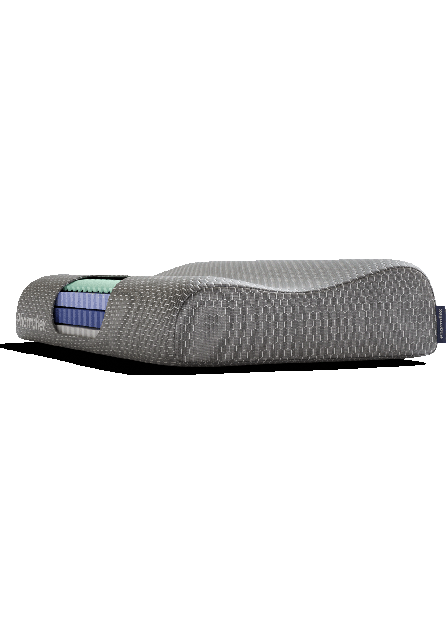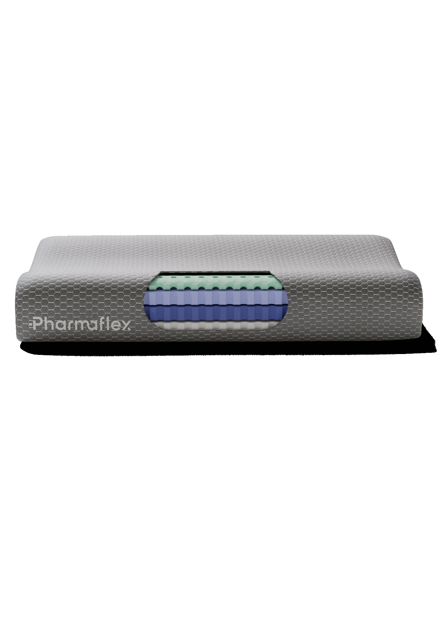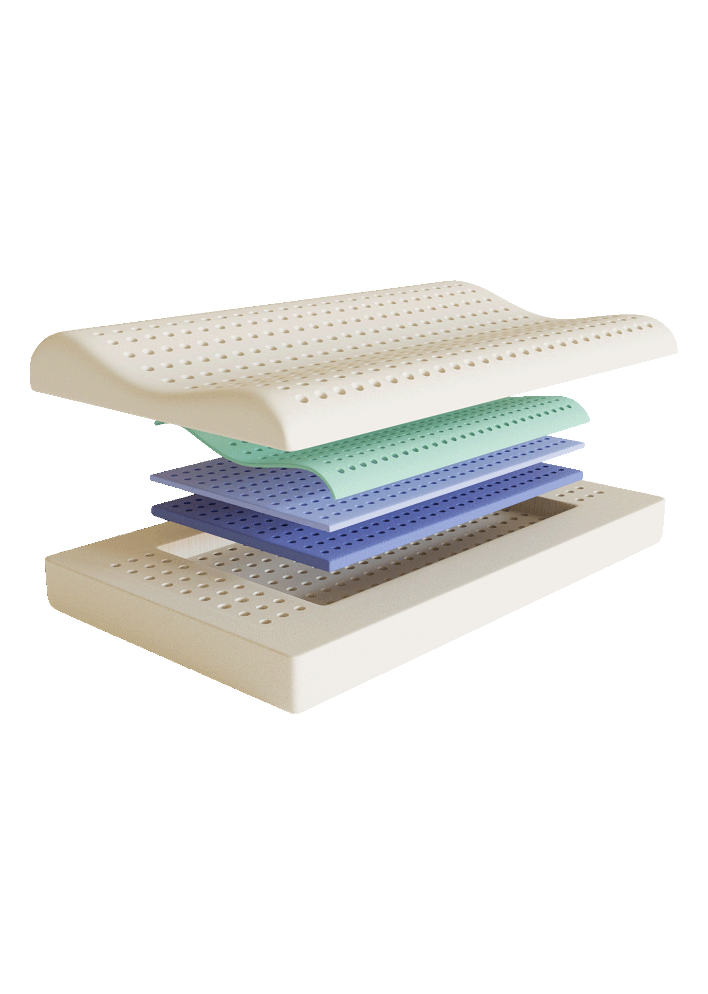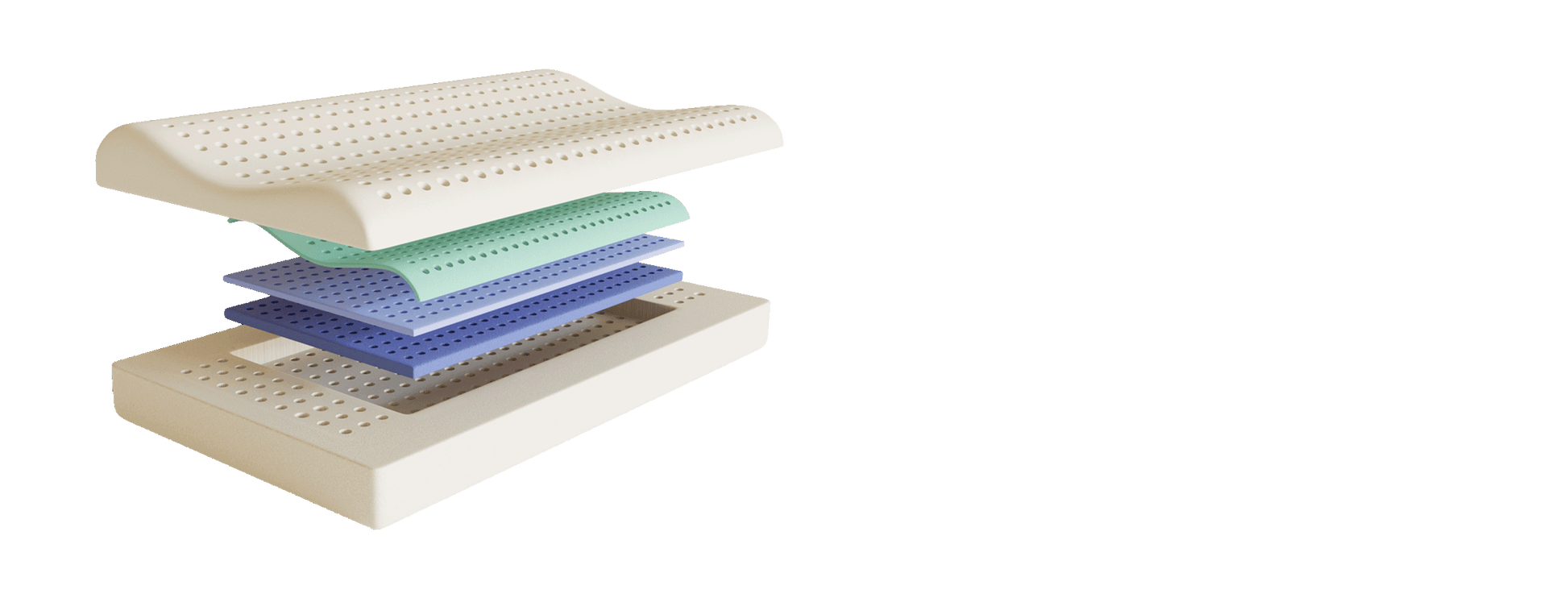 Cinque strati in Memory AirCell con densità progressive (45 kg/m³ esterni e 28–35–40 kg/m³ interni). Questa configurazione consente una transizione graduale tra accoglienza e sostegno, migliorando la stabilità dell’appoggio cervicale.
