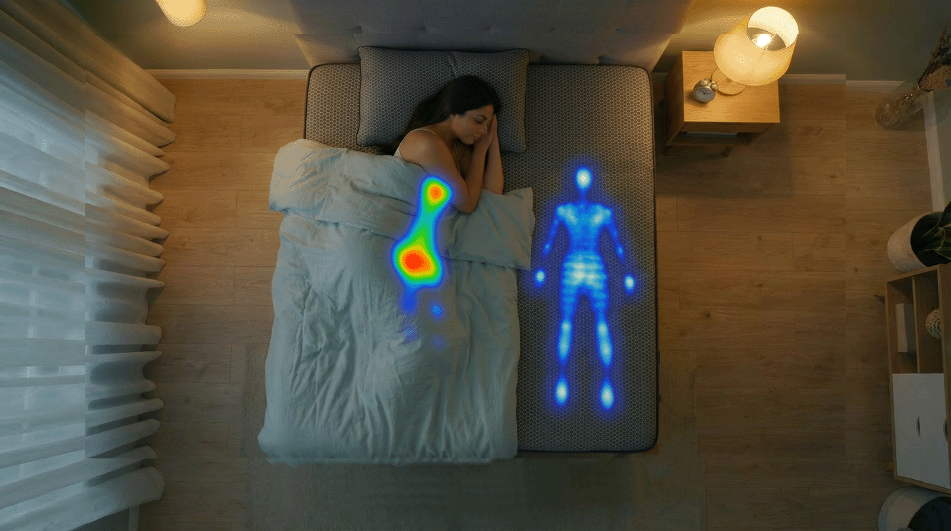 Misurazioni su mappa di pressione, indice di comfort e allineamento lombare: carico più uniforme, picchi attenuati e postura più stabile in supino e laterale.