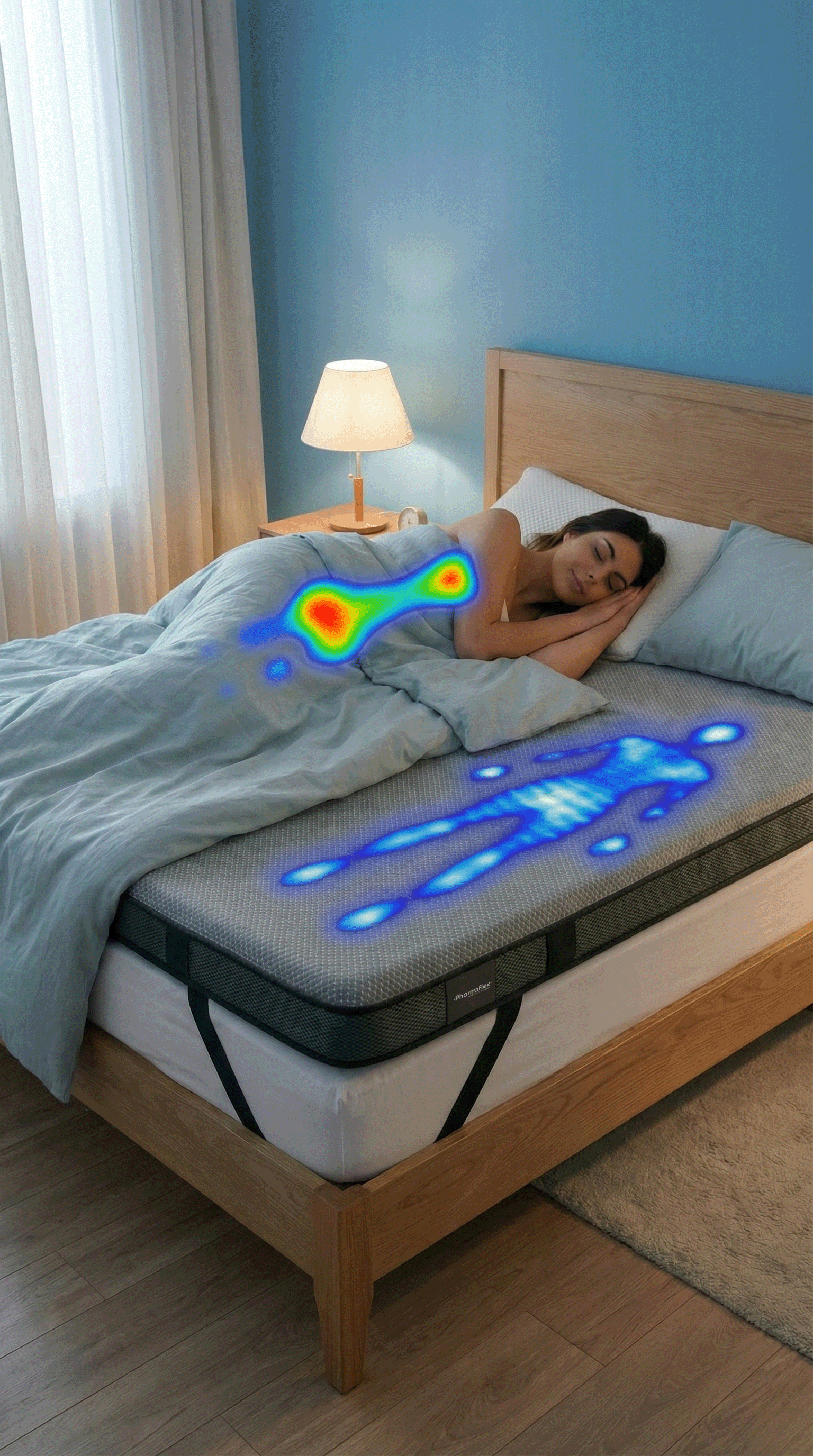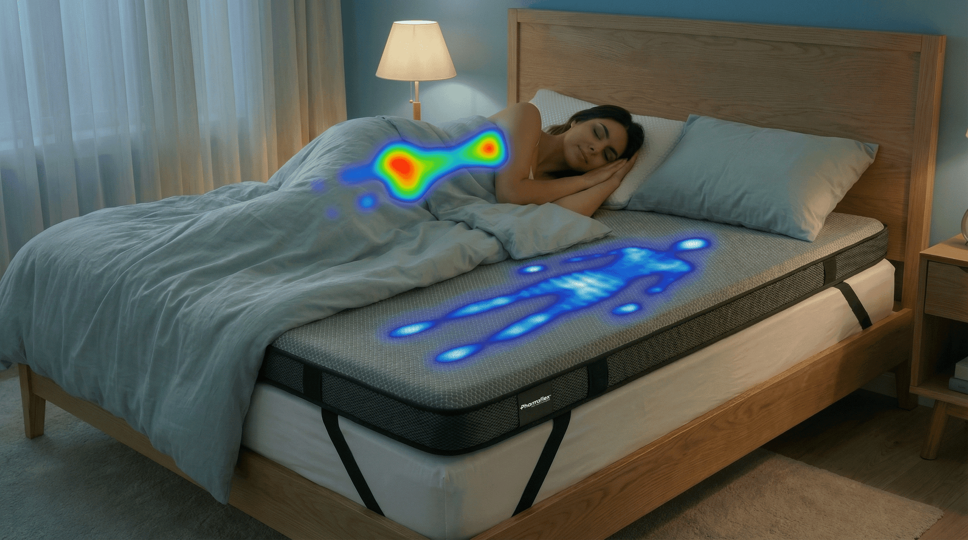 Misurazioni su mappa di pressione, indice di comfort e allineamento lombare: carico più uniforme, picchi attenuati e postura più stabile in supino e laterale.
